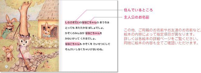 クリエイト・ア・ブックにはさまざまな種類の絵本があり、その内容によって指定できる項目が異なります。詳しくは各絵本の詳細ページから『指定できる項目』や絵本の内容をご確認ください。 |